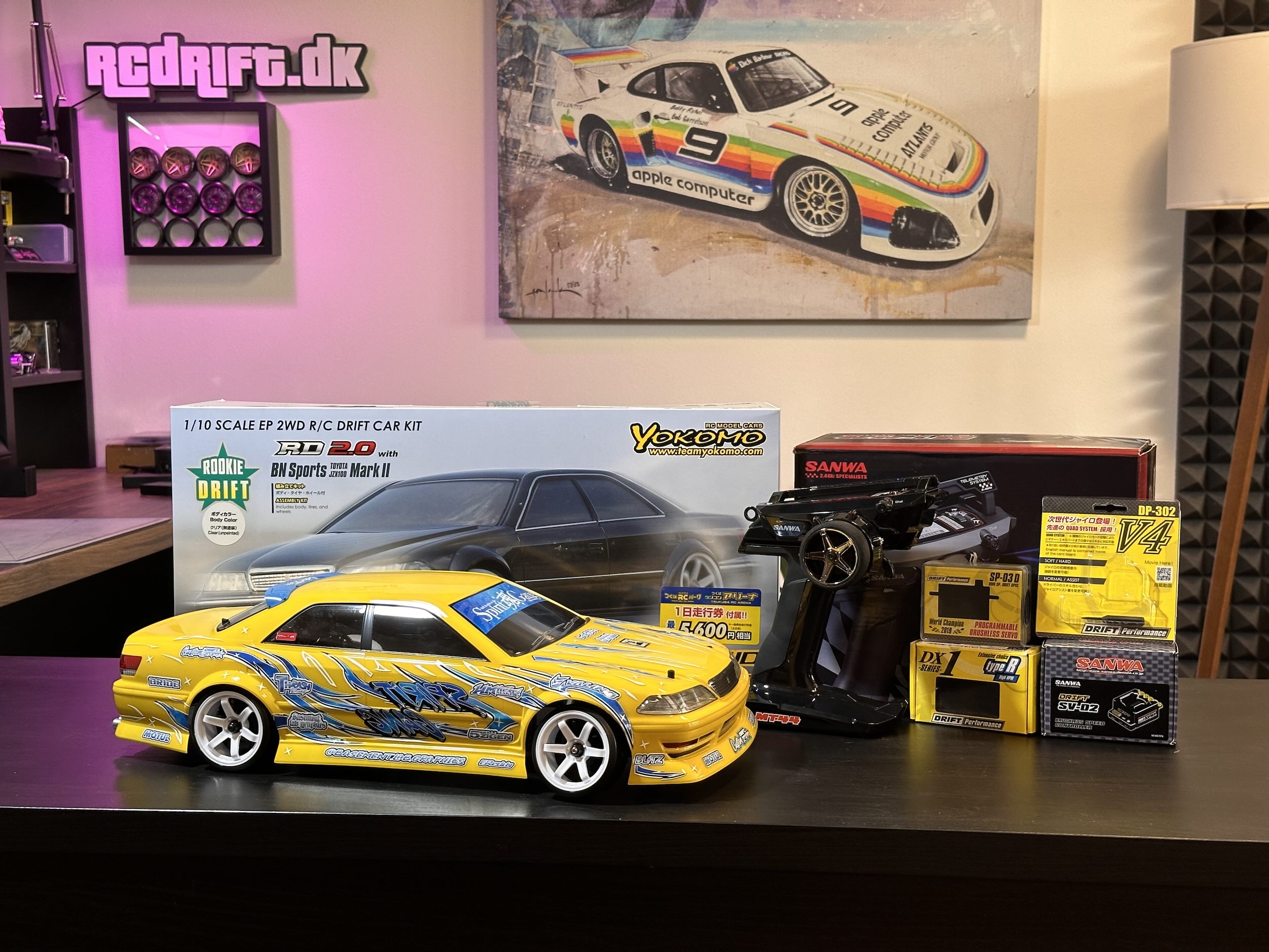 Zvláštní kapitolou je ručně lakovaná karoserie Yokomo JZX100 se speciálně namíchanou zlatavou metalízou a polepy Spirit Gang od Inkmotion.de.