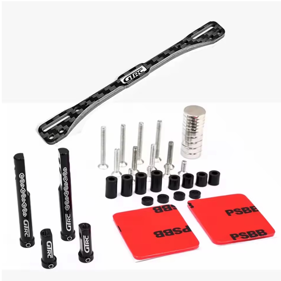 Magnetický držák karoserie přední + zadní s karbonovou rozpěrou. Nastavení pro různé šířky podvozků a různé velikosti karoserií. Kompletní sada.