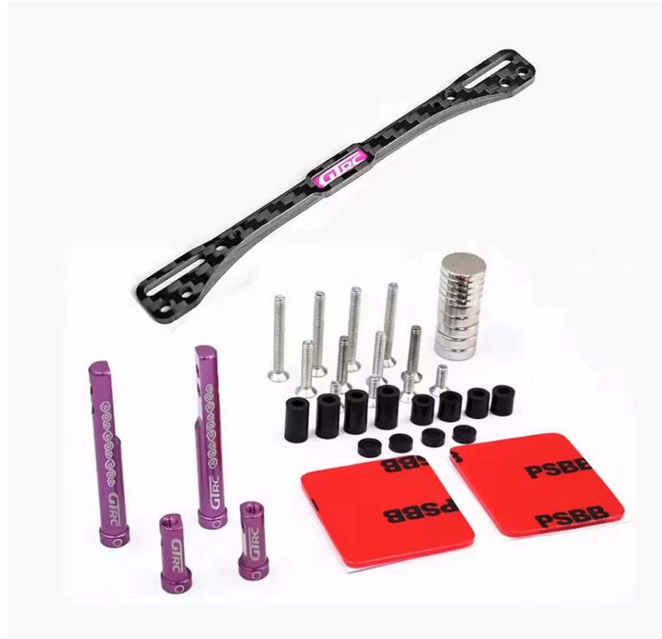 Magnetický držák karoserie přední + zadní s karbonovou rozpěrou. Nastavení pro různé šířky podvozků a různé velikosti karoserií. Kompletní sada.